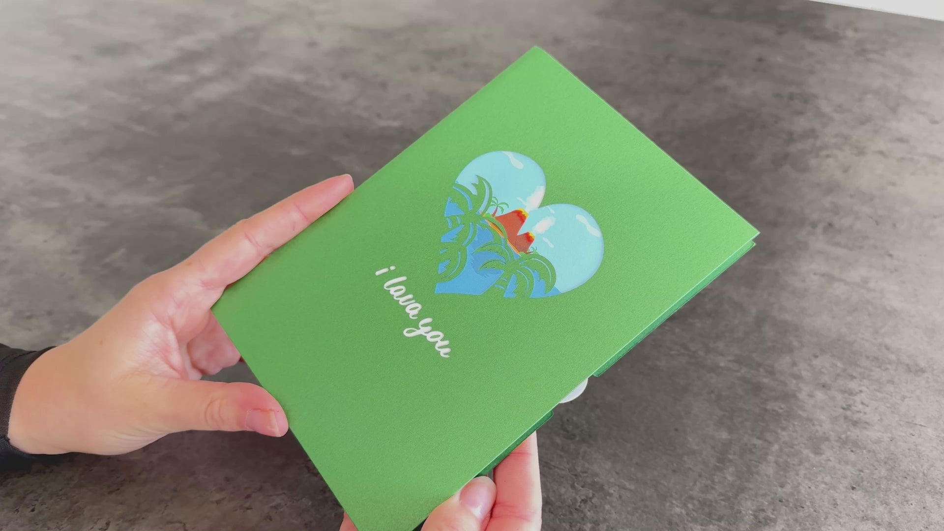 Auf der Vorderseite dieser charmanten Pop-Up-Karte ist herzförmig ein glühender Vulkan abgebildet, der Lava speit und mit einer verspielten Botschaft versehen ist: „I Lava You“. Der orangefarbene Vulkan steht im Kontrast zu einem strahlend blauen Himmel und symbolisiert die intensiven Gefühle der Liebe. Die grafische Gestaltung der Karte macht sofort neugierig auf das, was sich im Inneren verbirgt.
